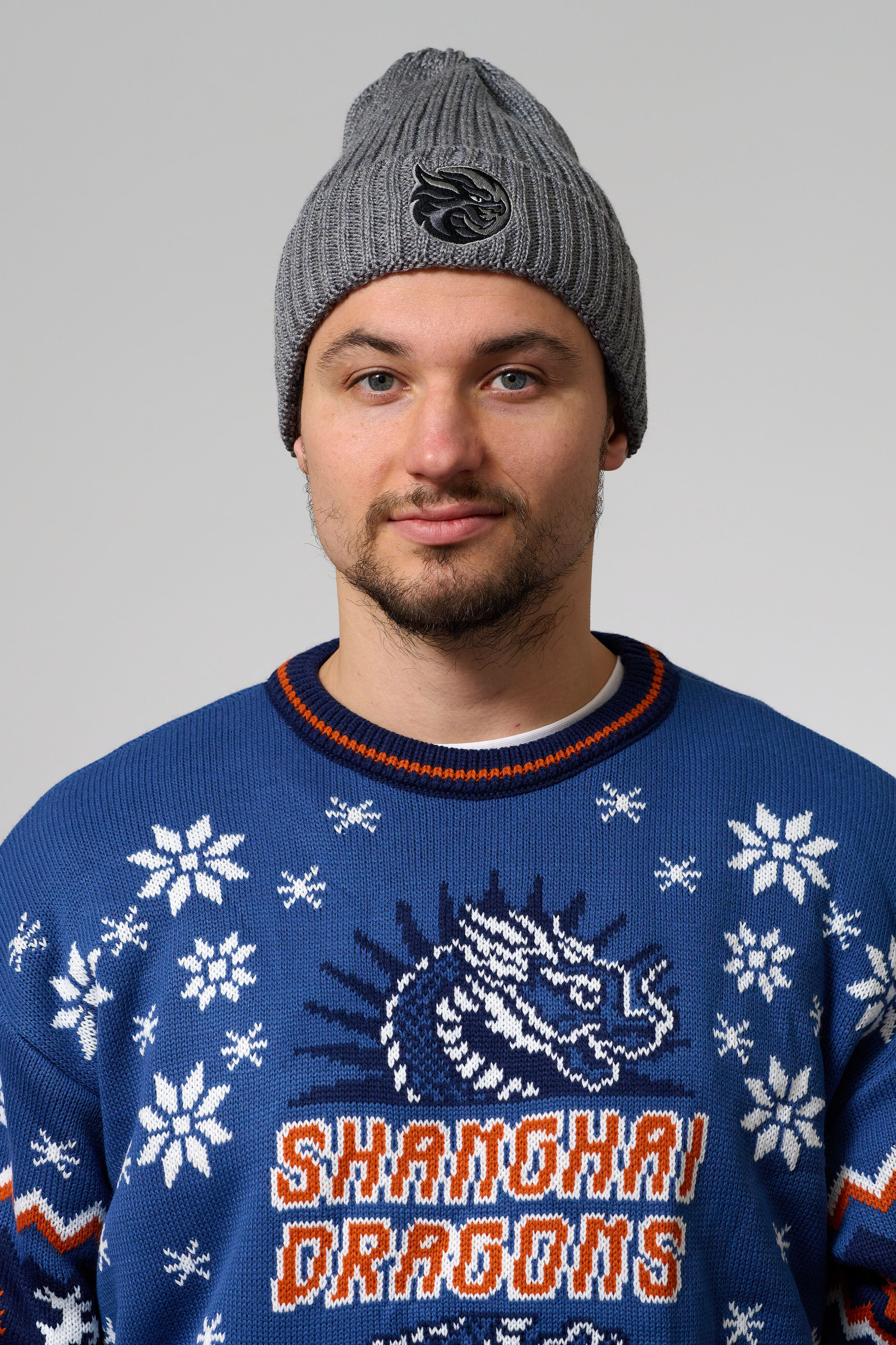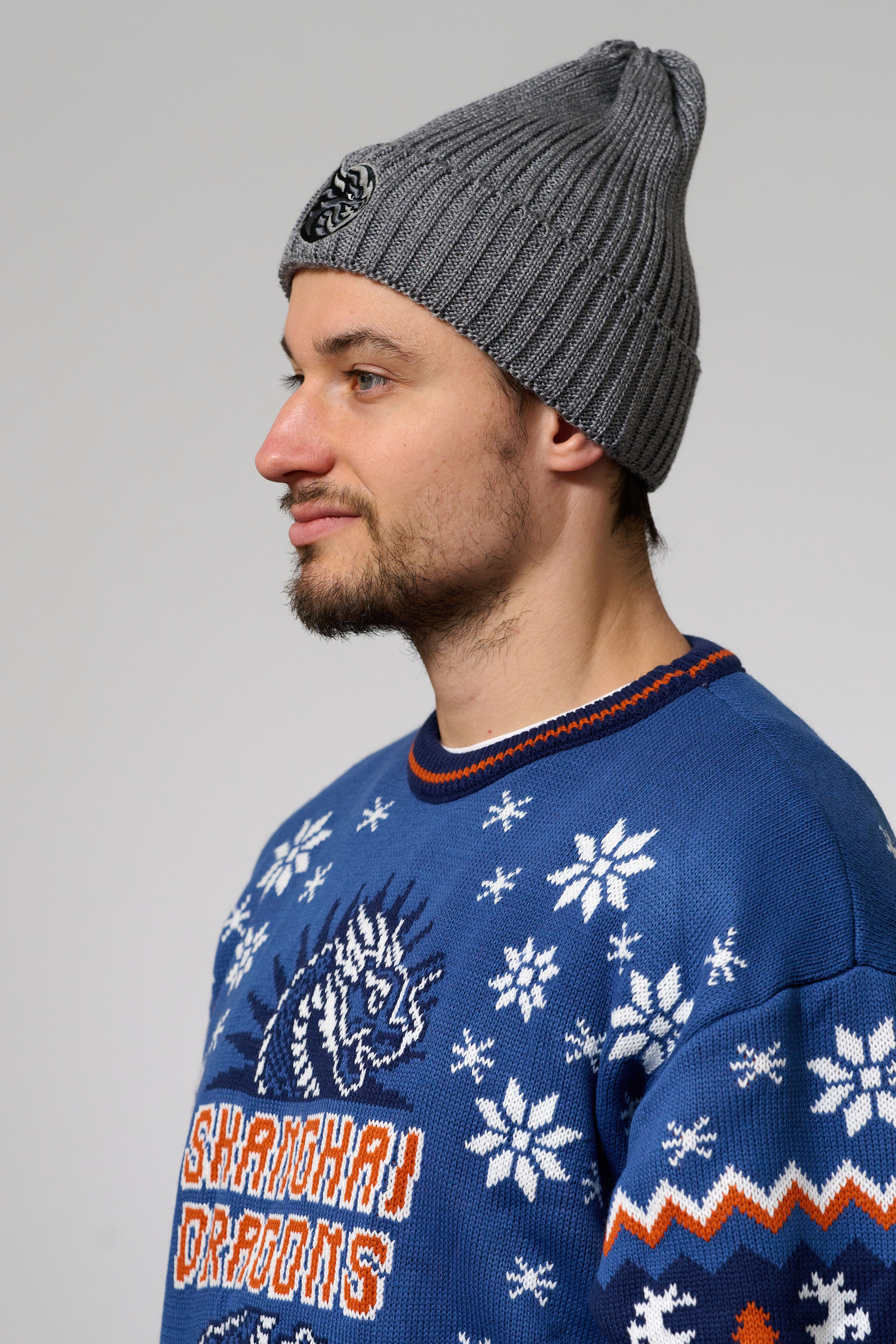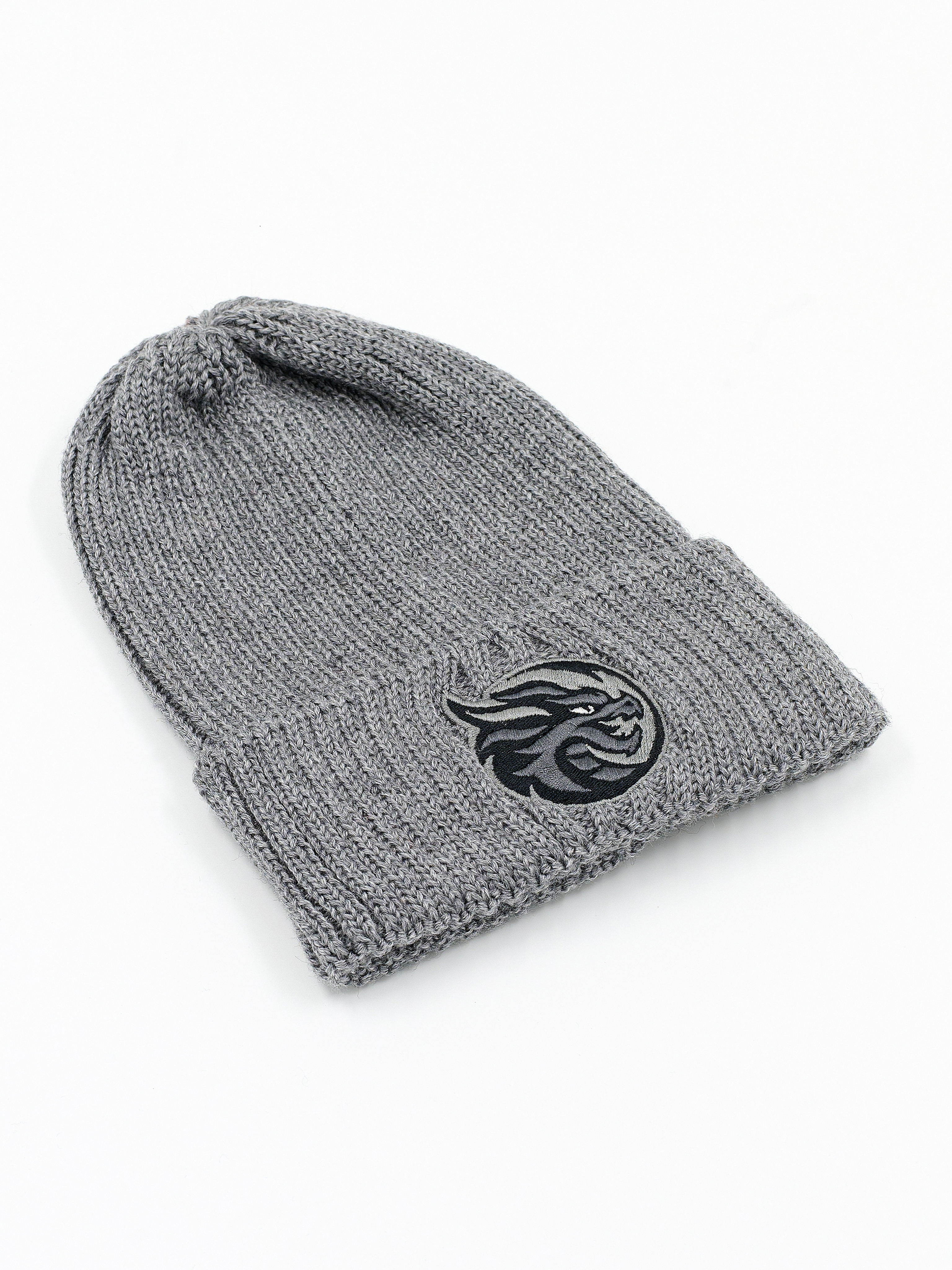 Классическая серая шапка из мелкой вязки с логотипом ХК «Шанхай Дрэгонс»